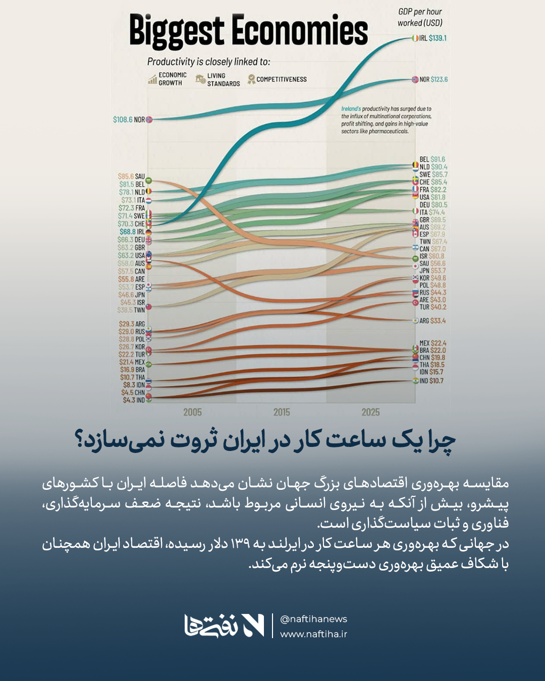 مقایسه بهرهوری اقتصادهای بزرگ جهان نشان میدهد فاصله ایران با کشورهای پیشرو، بیش از آنکه به نیروی انسانی مربوط باشد، نتیجه ضعف سرمایهگذاری، فناوری و ثبات سیاستگذاری است. نفتی ها /مقایسه بهرهوری اقتصادهای بزرگ جهان نشان میدهد فاصله ایران با کشورهای پیشرو، بیش از آنکه به نیروی انسانی مربوط باشد، نتیجه ضعف